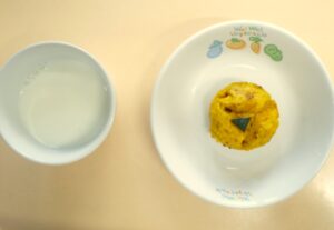 離乳食(後期)午後おやつ:かぼちゃ蒸しパン、麦茶