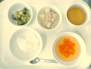 離乳食(後期)昼食:おかゆまたは軟飯、じゃがいものそぼろ煮、しらすあえ、すまし汁