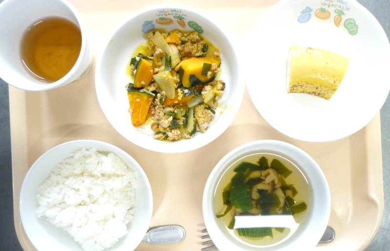 昼食:ご飯、魚のごま味噌だれ、じゃがいもきんぴら、すまし汁、りんご(乳児のみ)、麦茶