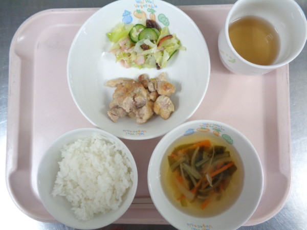 ご飯、野菜入りわかめスープ、チキンソテーカレー風味、グリーンサラダ339kcal