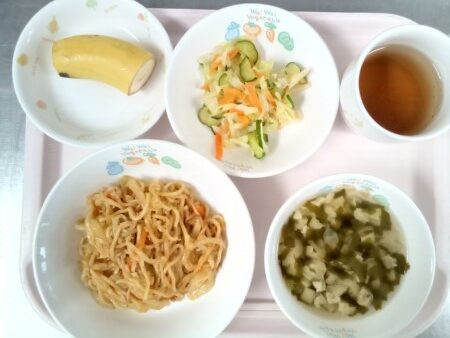 カレー焼きそば、わかめスープ、キャベツの中華和え、バナナ・・・269kcal