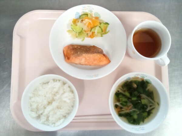 ごはん、中華スープ、鮭のバターしょうゆ焼き、みかんサラダ・・・331kcal