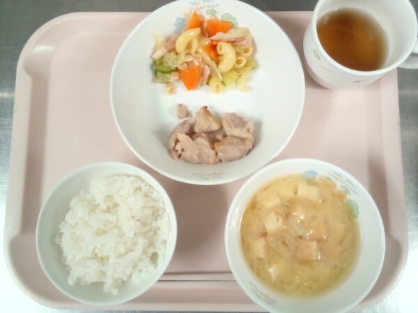 ごはん、味噌汁、鶏肉のさっぱり煮、マカロニサラダ・・・396kcal