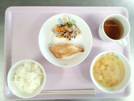 ごはん、魚の南部焼き、ひじきサラダ、味噌汁