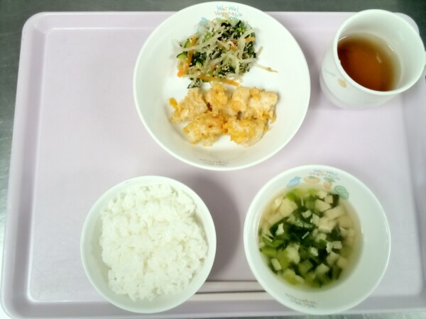 ごはん、鶏肉のこんがり焼き、ごまじゃこ和え、きつねスープ