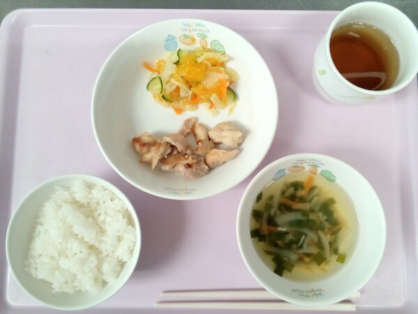 ごはん、ジンジャーチキン、みかんサラダ、えのきのスープ