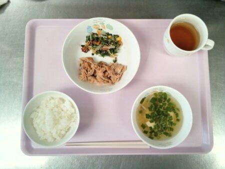 ごはん、トンテキ、青菜とハムのごま和え、豆腐と野菜のスープ