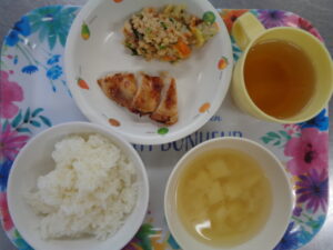 今日の献立は、野菜たっぷり味噌ラーメン、じゃが芋のマヨネーズ焼き、みかん、チーズキャンディ(以上児のみ)です。アレルギー食(卵)は麺をうどん麺に変更、じゃが芋のマヨネーズ焼きのマヨネーズを除去し、 砂糖と塩で味付けしています。離乳食(後期)は具だくさんうどん、ポテトサラダ、さつま芋スティック、バナナです。離乳食(中期)は具だくさんうどん、ポテトサラダ、バナナです。
