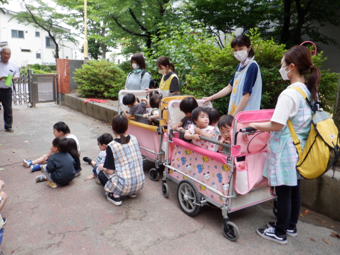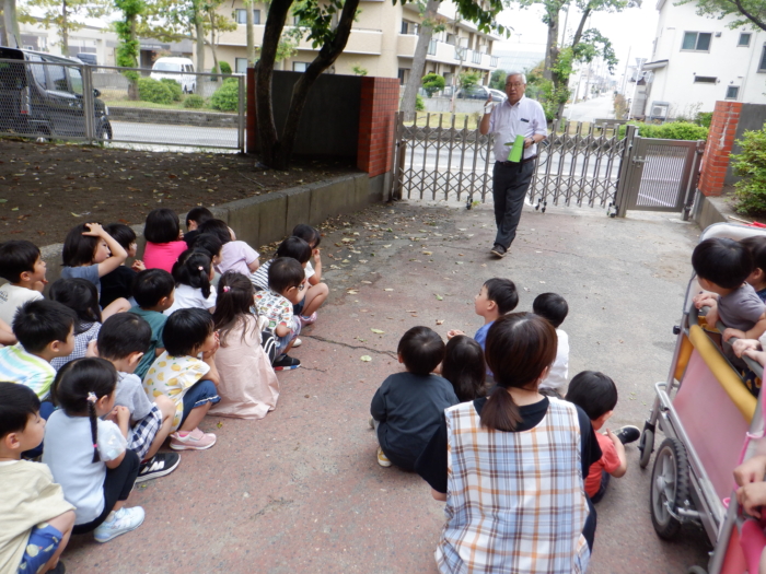 今日は火災を想定した避難訓練をしました。子どもたちは先生たちのお話をよく聞きながら、落ち着いて避難場所の園庭まで移動することができました。園長先生から避難の際に、自分の身を守るために大事なことを教えてもらいました。