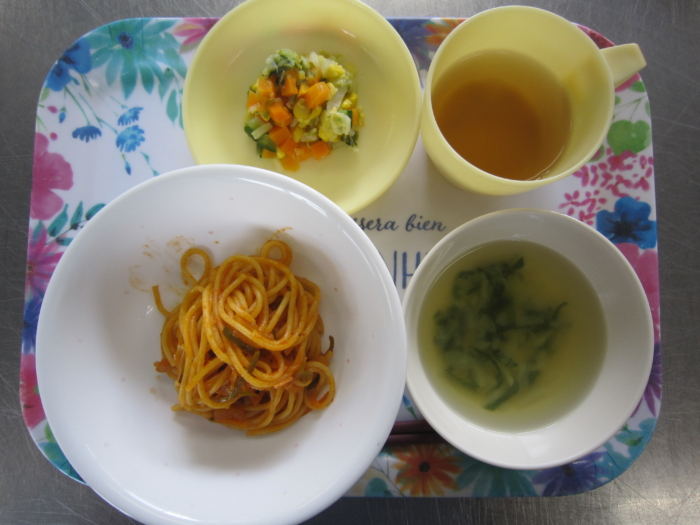 今日の給食は、ナポリタン、コーンサラダ、チンゲン菜のスープです。