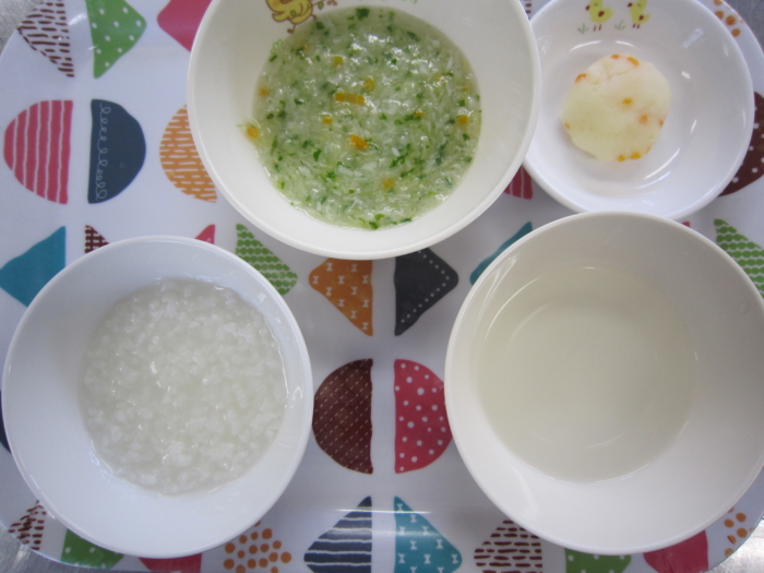 離乳食(中期)は、7倍粥、白身魚と野菜のあんかけ煮、じゃが芋と人参のマッシュ、野菜スープです。
