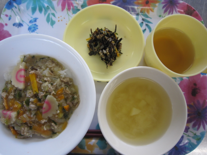 今日の給食は、中華丼、ひじきのサラダ、じゃが芋の味噌汁です。