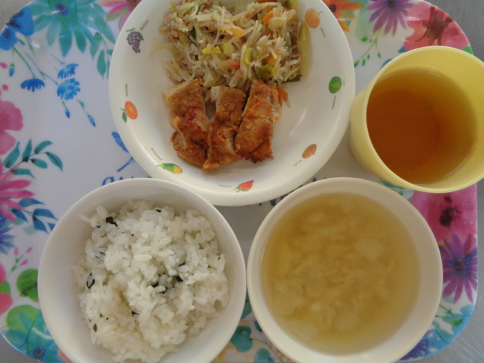 今日の給食は、わかめごはん、タンドリーチキン、ビーフン炒め、白菜の味噌汁です。