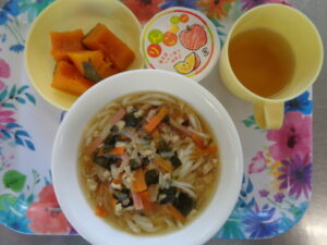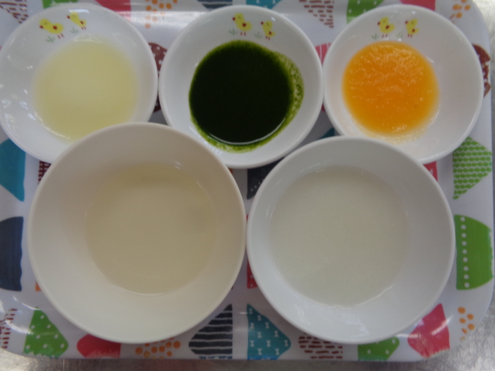 今日の離乳食(初期)は、つぶし粥、ほうれん草ペースト、人参ペースト、キャベツペースト、野菜スープです。