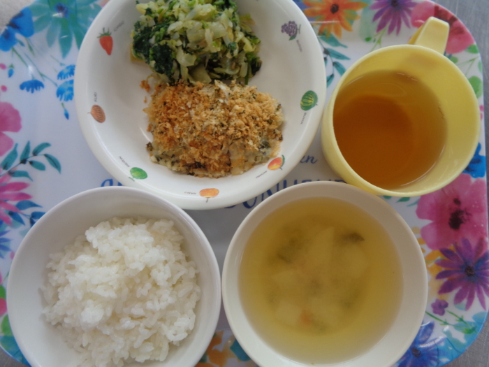 今日の給食は、ごはん、サワラの香草パン粉焼き、胡麻和え、かぶの味噌汁です。