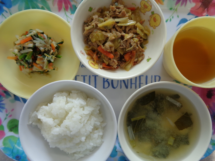 今日の給食は、ごはん、回鍋肉、おかか和え、小松菜の味噌汁です。