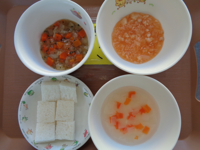 今日の離乳食(後期)は、食パン、サワラのトマト煮、胡麻和え、オニオンスープです。