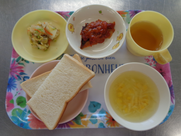 今日の給食は、食パン、サワラのトマト煮、胡麻和え、オニオンスープです。