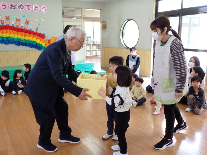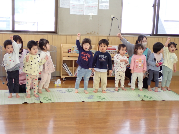今日は、新入・進級を祝う会を行いました。各クラスの目標を発表し合ったり、歌「ちゅーりっぷ」をうたったりしました。また、おめでとうカードなどのお祝いをもらい、入園や進級をみんなで喜び合いました。