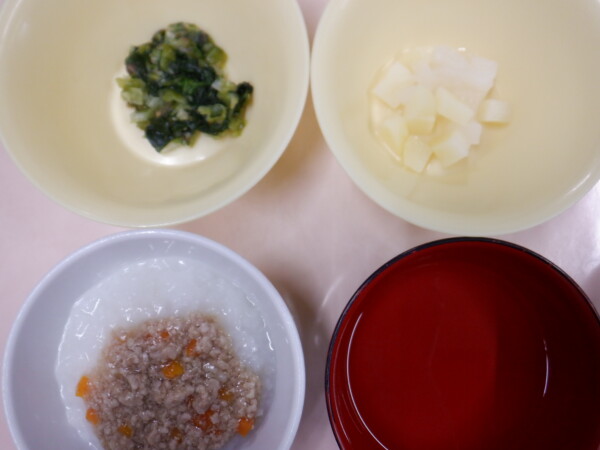 離乳食は、 マーボー風粥(全粥、人参、豚ひき肉) うわずみ 野菜のだし煮(キャベツ、ほうれん草) コロコロ野菜(大根、じゃが芋) です。
