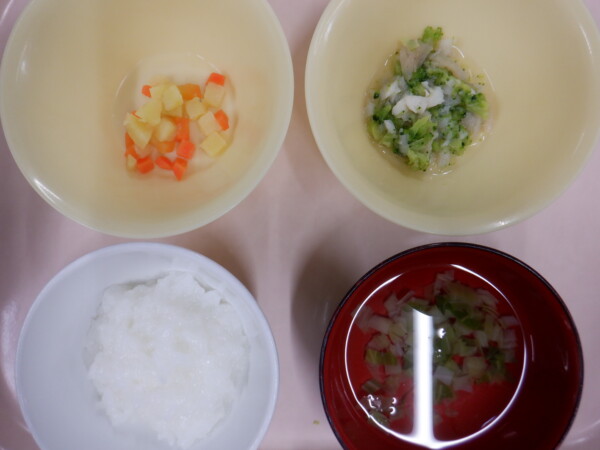 離乳食は、全粥 うわずみ(キャベツ) タラの塩煮(タラ、ブロッコリー) きんぴら野菜(さつま芋、人参) です。