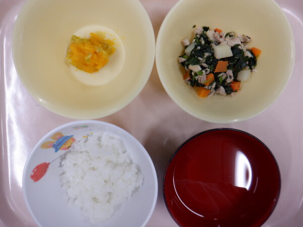 離乳食は、 全粥 うわずみ 田舎煮(鶏肉、人参、ほうれん草) マッシュかぼちゃ(かぼちゃ、キャベツ) です。