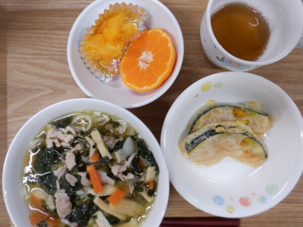 今日の給食は、 きつねうどん かぼちゃの天ぷら風 みかん です。