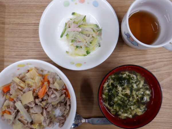今日の給食は、 中華丼 春雨サラダ わかめと卵のスープ です。