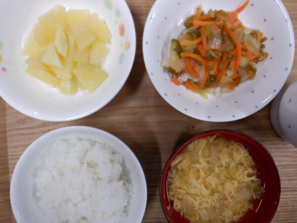 離乳食は、7倍粥 うわずみ 魚のふっくら煮(カレイ 人参 こまつな) さつまいもの甘煮(さつまいも 大根)です。