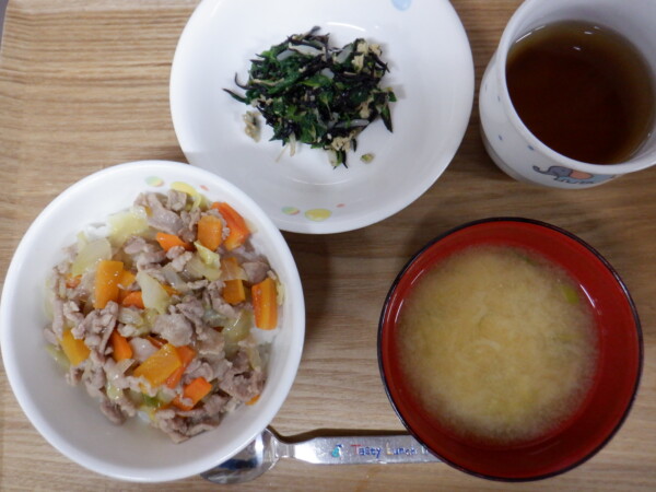 今日の給食は、 豚肉の生姜焼き丼 なめたけ和え みそ汁 です。