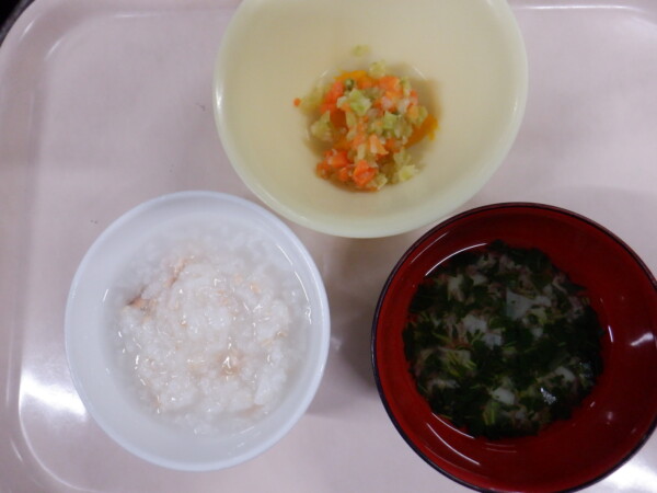 離乳食は、 鮭粥(7倍粥、鮭) うわずみ(小松菜、じゃが芋) サラダ(キャベツ、人参、かぼちゃ) です。