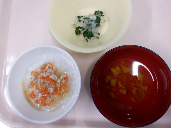離乳食は、 鶏あんかけ粥(全粥、鶏肉、玉ねぎ、人参) うわずみ(かぼちゃ) 和え物(ほうれん草、大根) です。