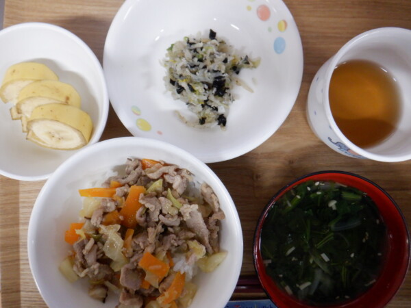 今日の給食は、 焼肉丼 もやしの海苔和え 中華スープ バナナ です。